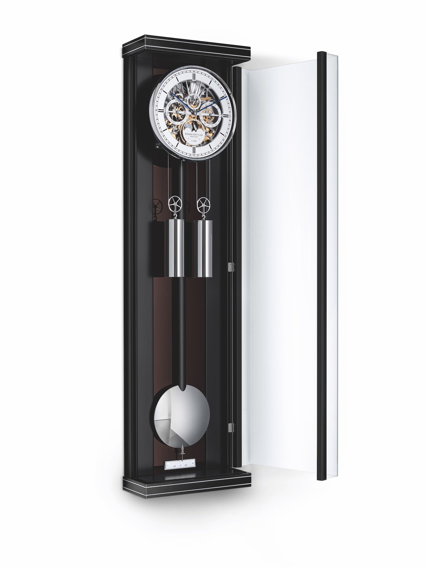 A calendar displaying the date, day of the week and moon phase (which is painted by hand, as usual at Erwin Sattler), a half-hour striking mechanism with a repetition and silencing function, and the hand-polished and domed hands complete the elegant appearance.