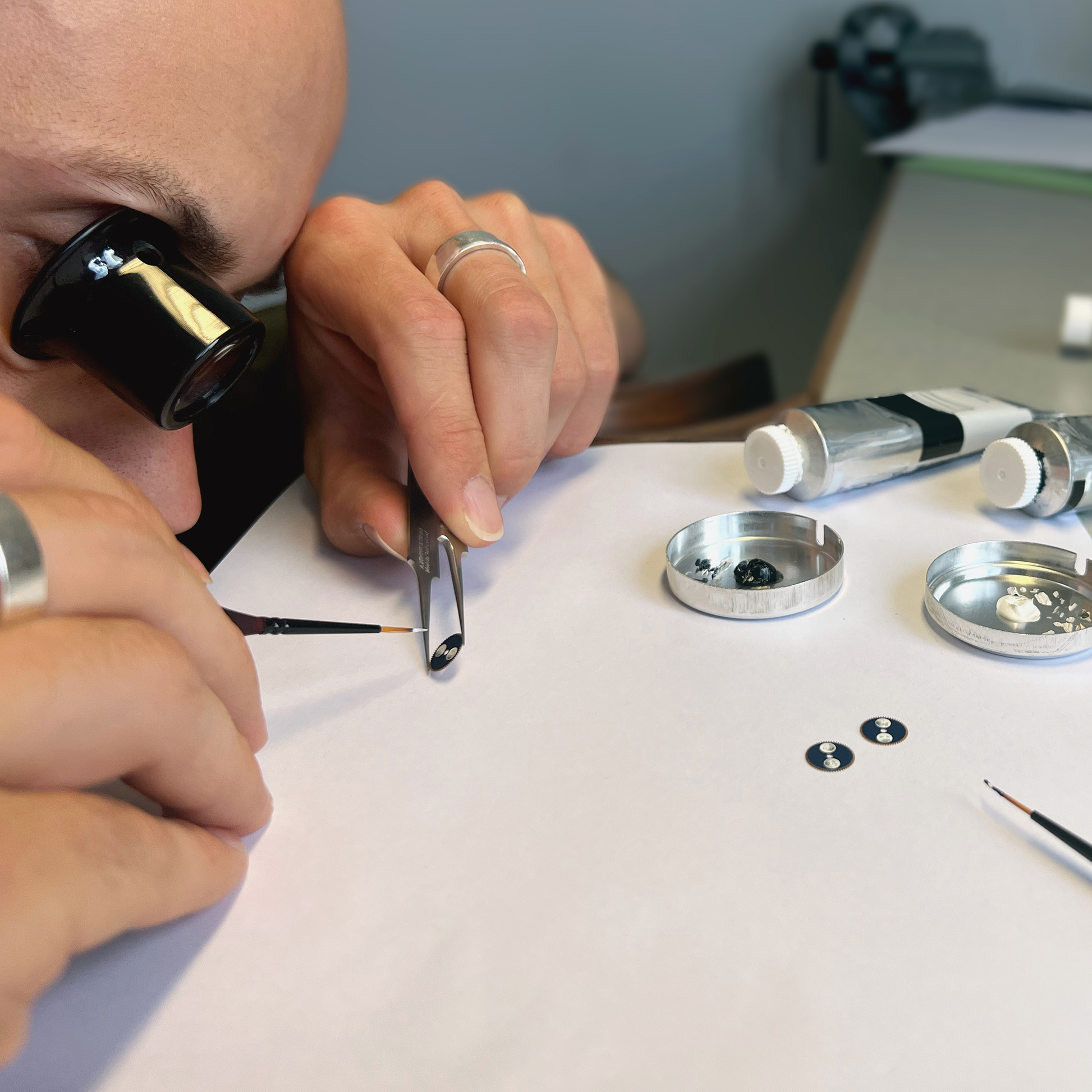 Each piece is made unique by a lovingly skeletonised and engraved automatic rotor, the hand-painted moon phase and the individual numbering.
