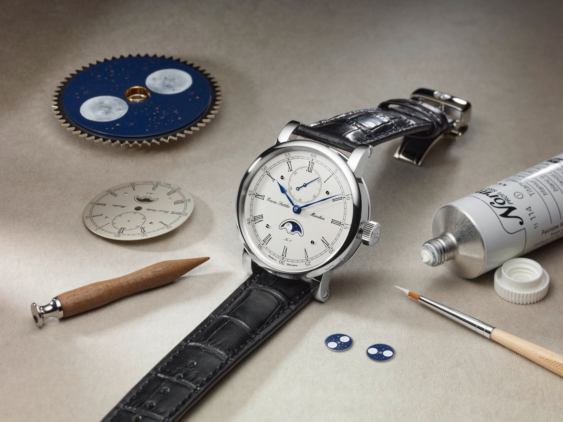 | Dial | Silver dial, hand-painted moon phase , jumping »small second«, consecutive numbering |