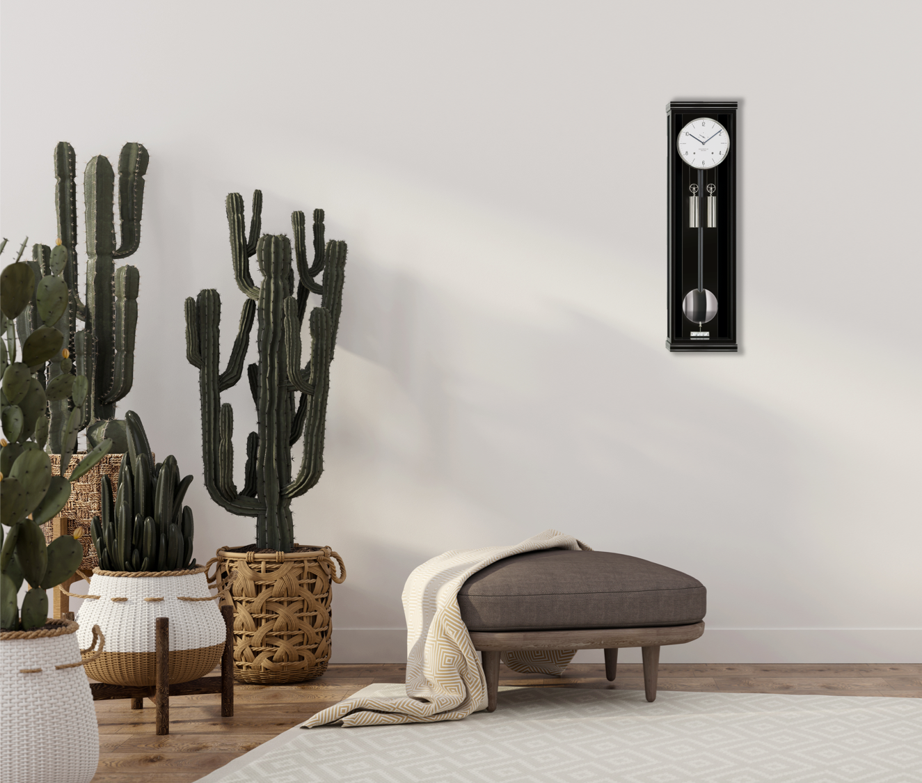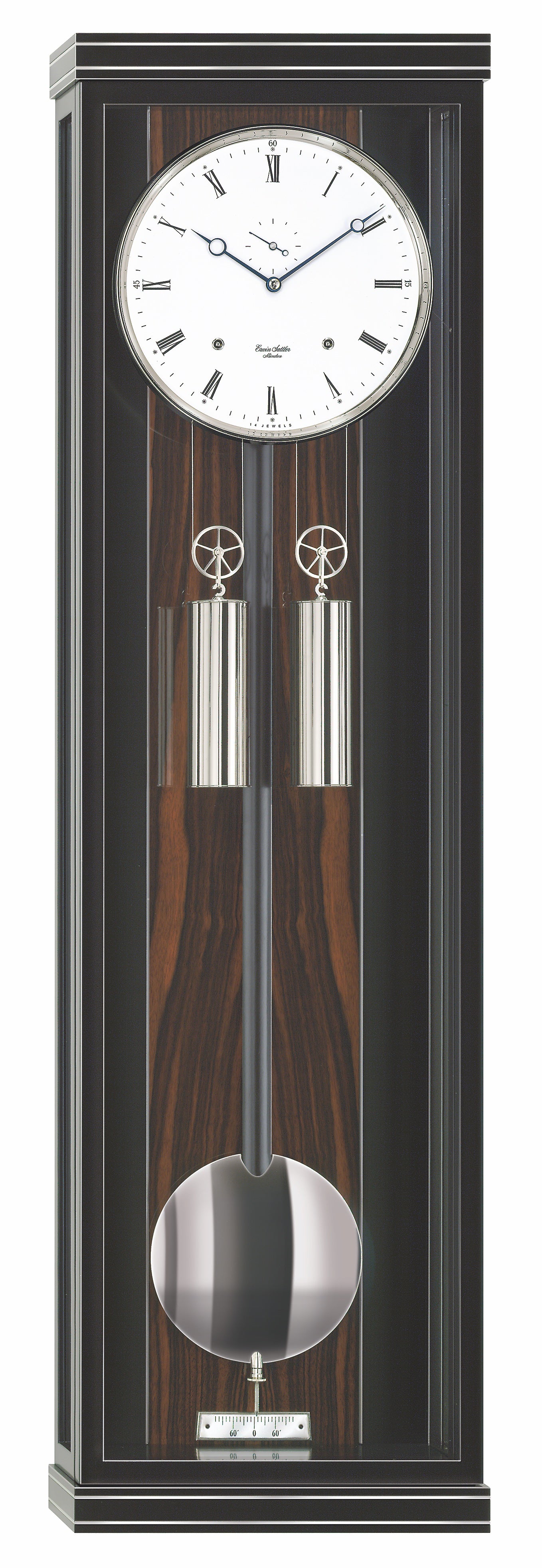 Very slim movements and strikingly small weights used to be typical for these precious regulators, and still are now. With its quiet ticking, the elegantly subtle pendulum swing and its wonderfully tuneful half-hourly strike, this sophisticated clock is a particularly fine accessory for the home or office.