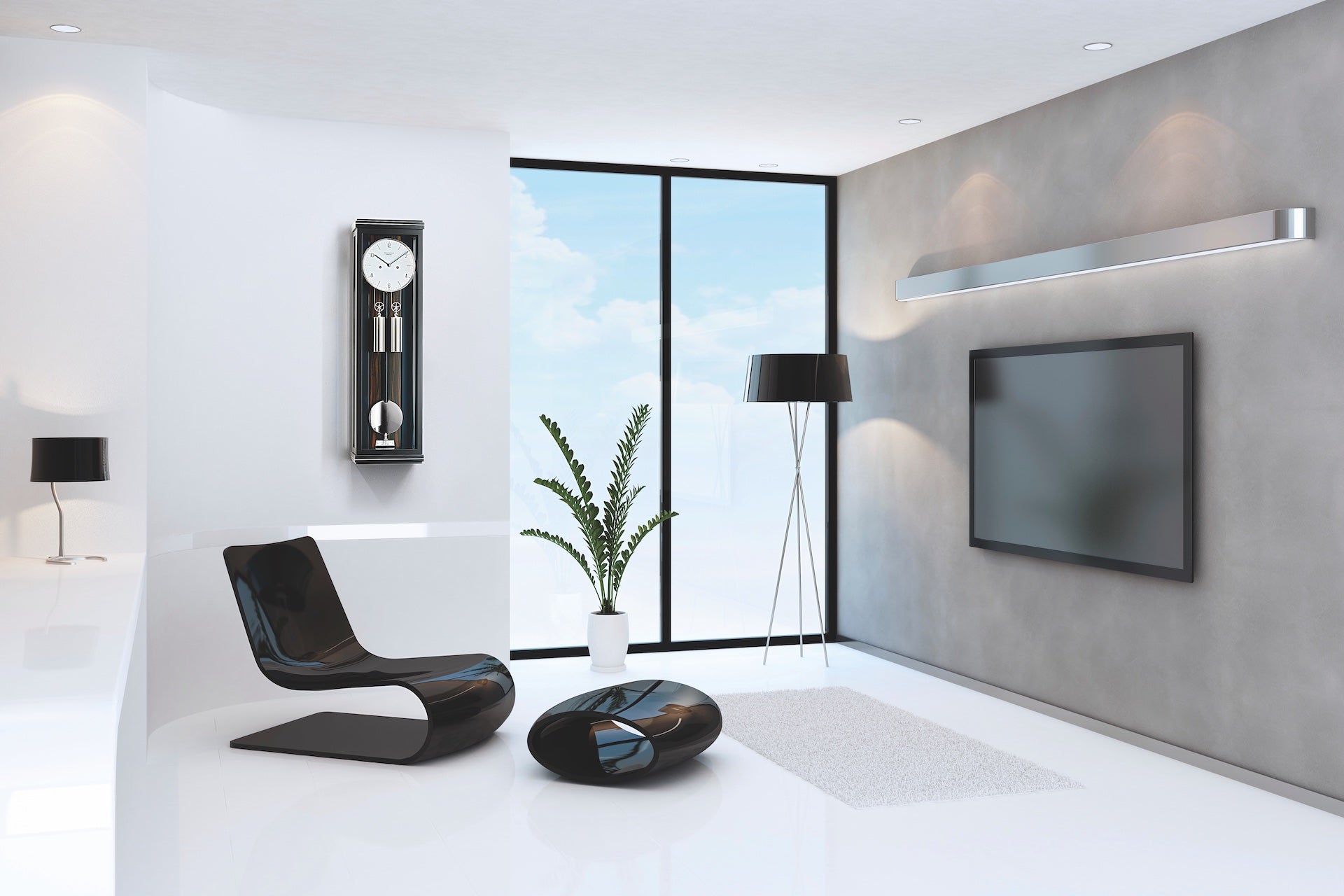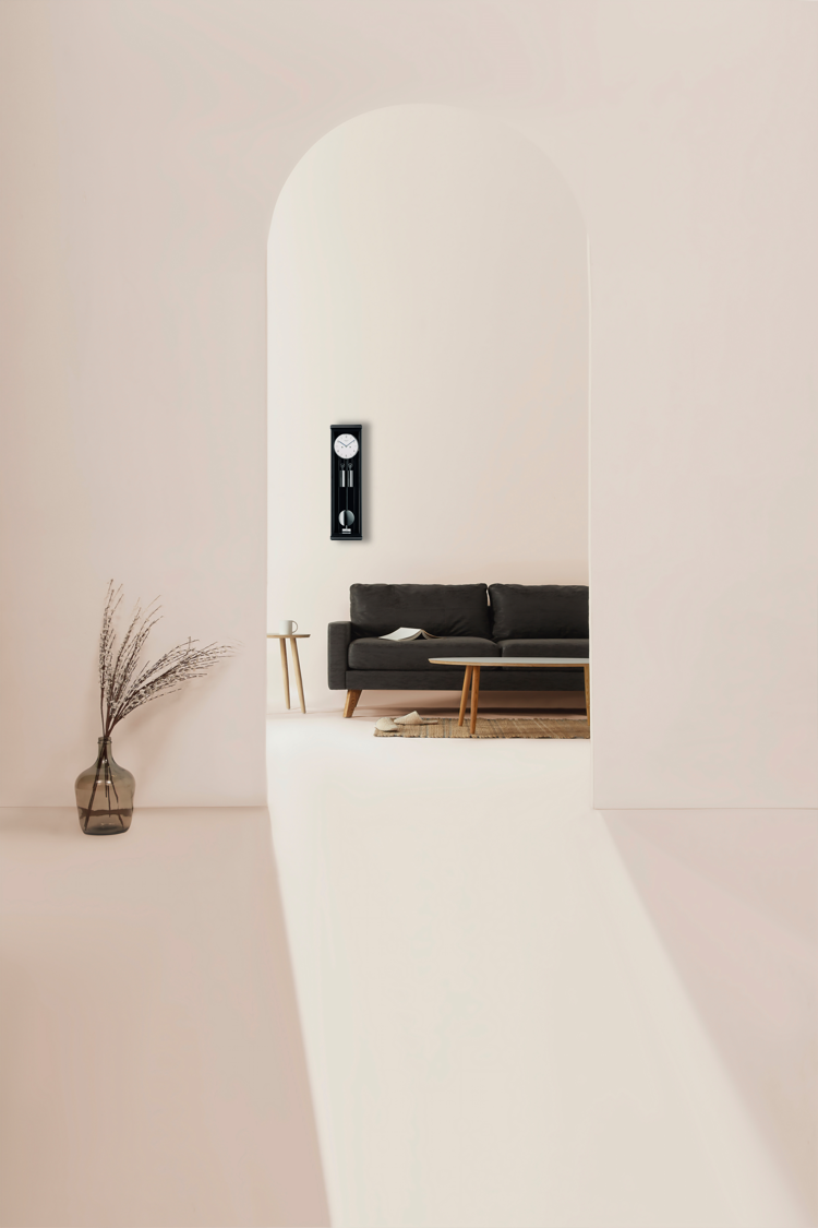 Its unique allure is due to its new look, which is dominated by the simple yet elegant case finished in black varnish with delicate metal inlays on the base and rim. This demure regulator is then finished off with a fourtime- fired high-quality enamel dial in a modern Arabic Bauhaus design with two blued steel hands showing the hours and minutes. Its characteristic, timeless appearance – which is also evident from its name – integrates perfectly with its surroundings, whether in classical décor or modern elegance.