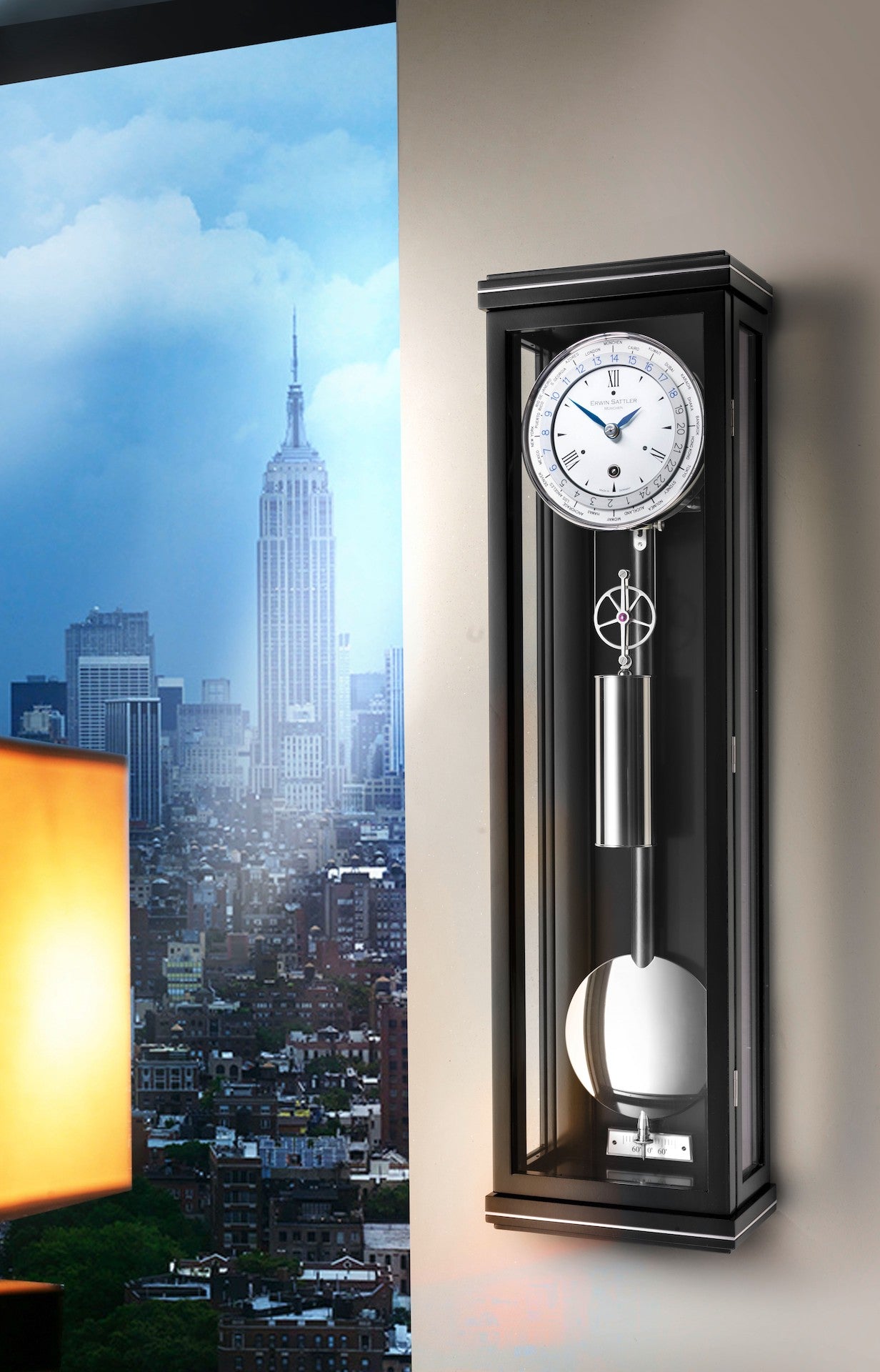 The 24-hour disc turns counterclockwise. Setting the local time by simply turning the hands also moves this disc accordingly. The home time is set by moving the city ring individually to the 12 o’clock position. The times in the other 23 time zones always remain visible at a glance thanks to the numerals on the 24-hour disc below the relevant place name. The Classica W60 M’s elegant black varnish case with delicate metal inlays houses the calibre 1325 movement; developed exclusively for this ensemble, this complex mechanism is admirably easy and intuitive to operate. Its power reserve of two weeks, its longevity and its superior quality inner workings featuring jewel ball bearings and gold-plated wheels complete the beautiful clock, making it a true masterpiece. Whether in a living space or in an office, whether at home or a home from home – the Classica W60 M is a unique gem of a timepiece that deserves a special place in any room.