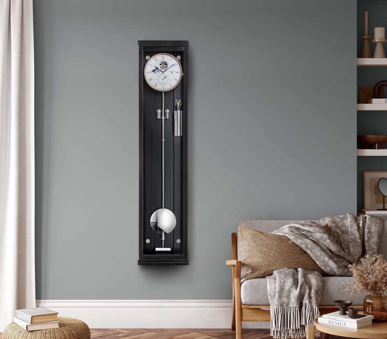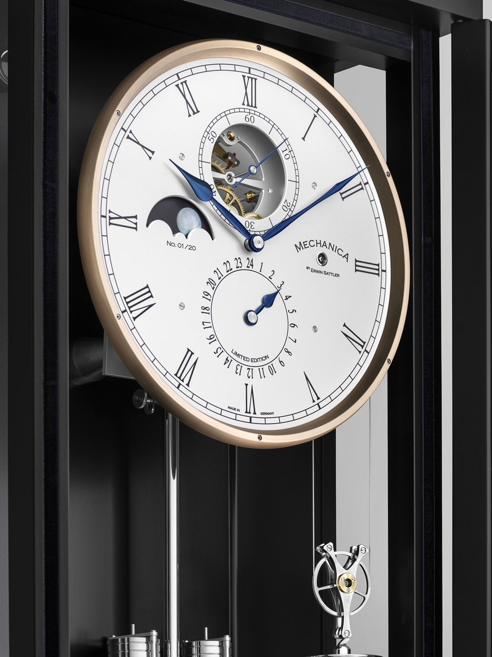 The addition to a precision pendulum clock with the useful complication of the moon phase is also a visual highlight. The moon shines in full splendor thanks to the shimmering, hand-polished and also domed mother-of-pearl inlays.