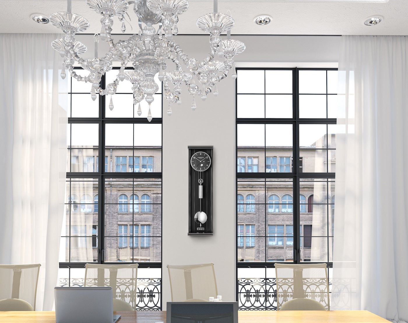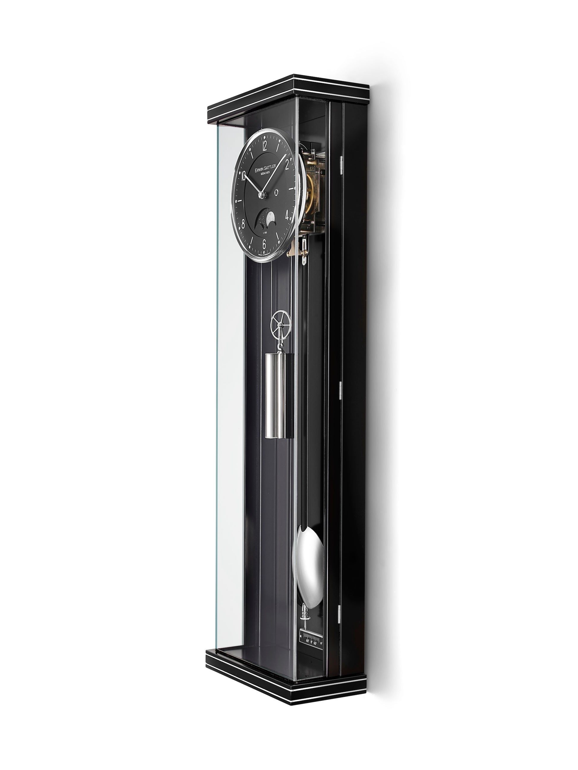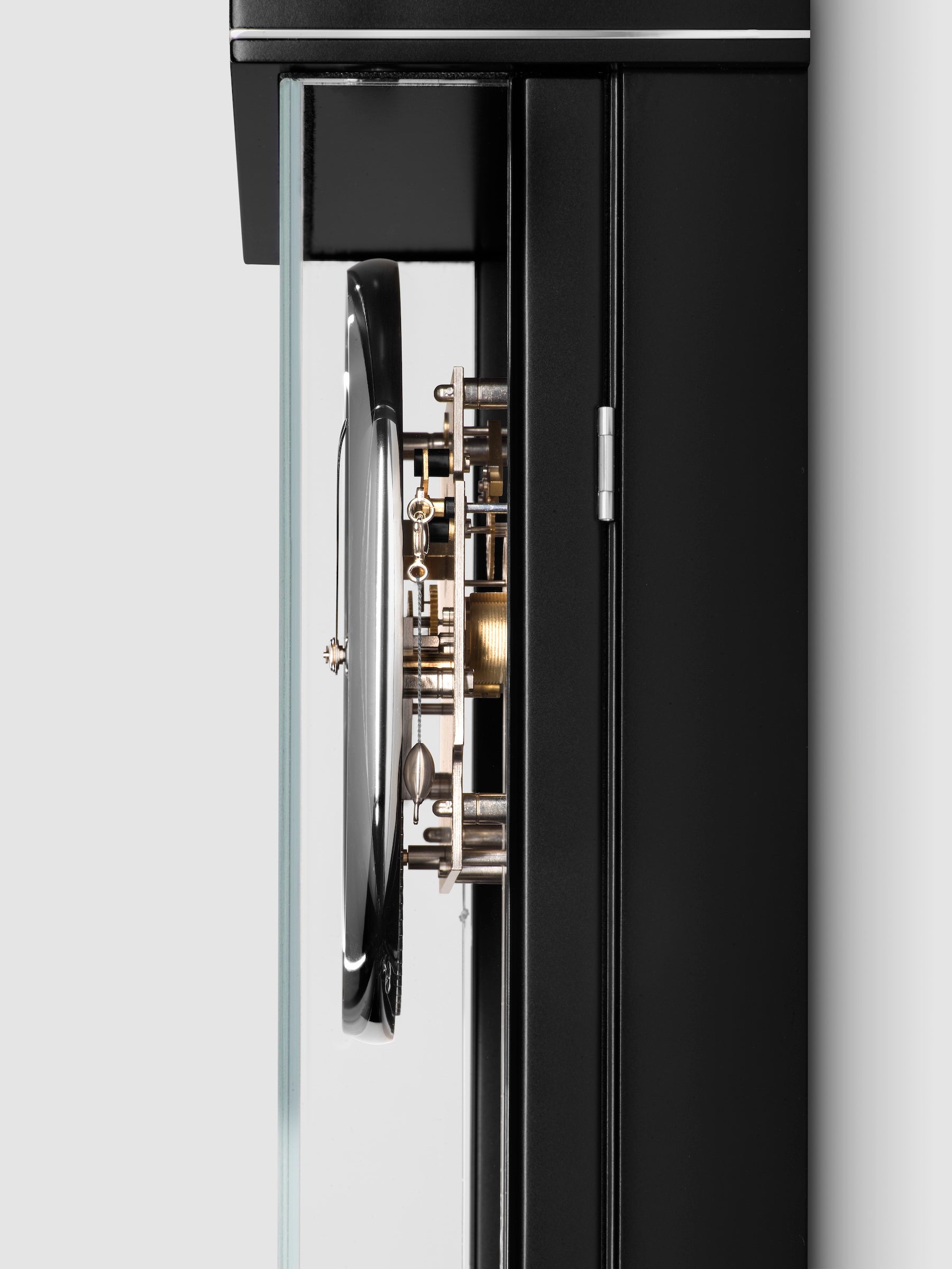 Measuring just 70 centimetres in height, this fine pendulum clock will find a dignified spot almost anywhere on the wall thanks to its discreet dimensions. Its wooden housing is 20 centimetres wide and 10 centimetres deep, and comes in black thanks to its elaborate varnish. High-quality metal inlays are included as decorative elements. The antireflective mineral glass allows a completely unhindered look at the dial, hands, movement and pendulum. The U-shaped glazing is affixed on a mitre in a single piece by expert craftsmen. And there is no need for a locking hook, thanks to the discreet magnetic catch on the door. The winding crank is required every seven days, and remains hidden behind a hatch in the base of the clock until it is next needed.
