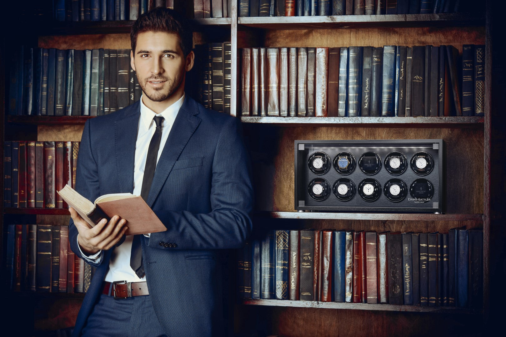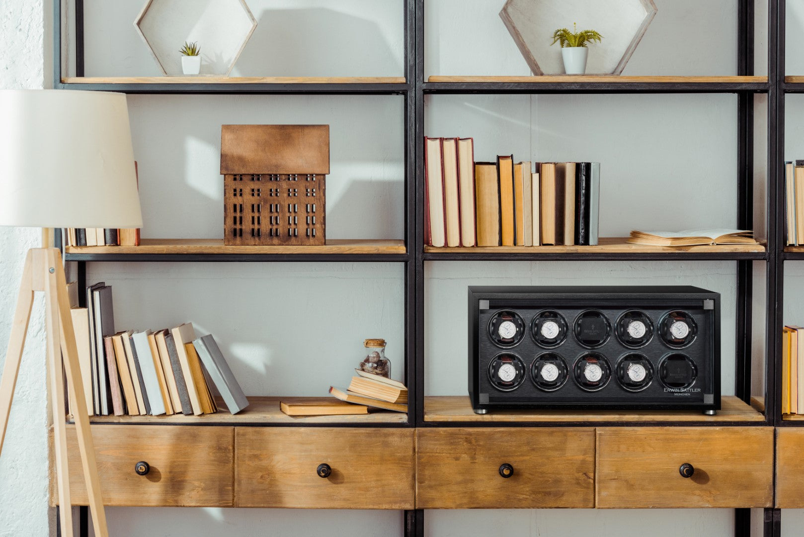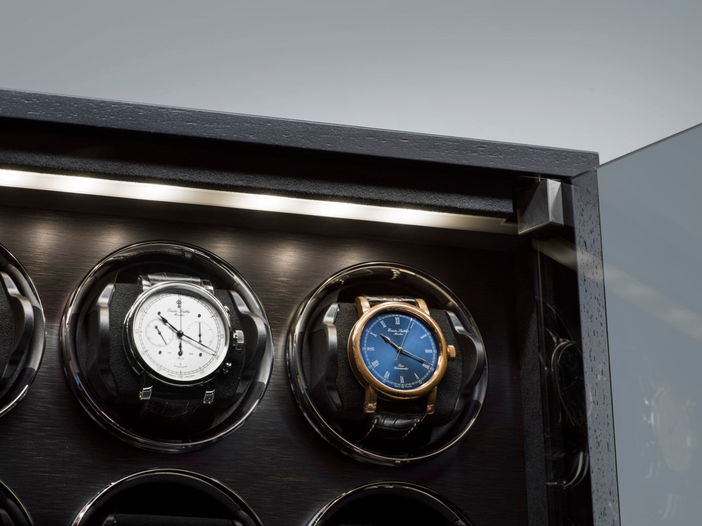 Ten wristwatches find protected behind a glass door its perfect place. Each individual watch winder can be programmed and controlled with any WIFI-capable device. The optimum values of each watch can be transferred from an enclosed database that contains more than 12,000 different automatic wristwatches and transmitted to the memory in the watch winder.