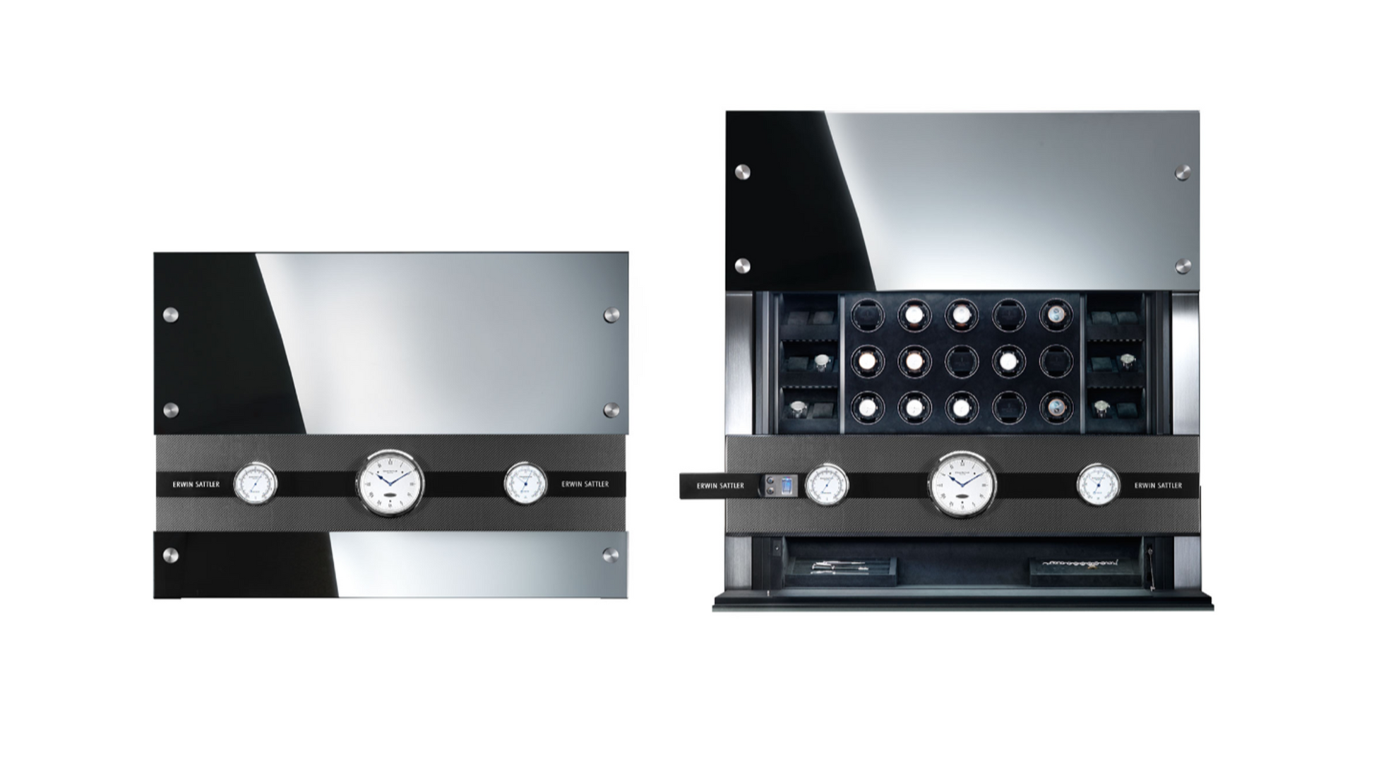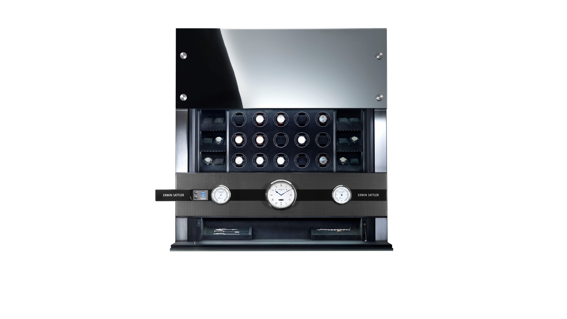Enthusiastic horological connoisseurs and collectors appreciate the Rotalis series from the Erwin Sattler manufacture. This stylish, functional and, at the same time, secure storage option for valuable wristwatches and other pieces of jewellery has now been enhanced by a new watch winder, the Rotalis 15. 15 precision watch winders, which can be individually programmed via WLAN, are hidden behind safety glass. Here, each of the watches that are entrusted to these winders is wound to perfectly meet its individual needs. At the same time, the winders present the timepieces from their best side – the 12 o’clock position. To ensure that these treasures are stored securely, a fingerprint scanner is used to open the glass panel. This is hidden behind a sliding panel that is located at the front.
