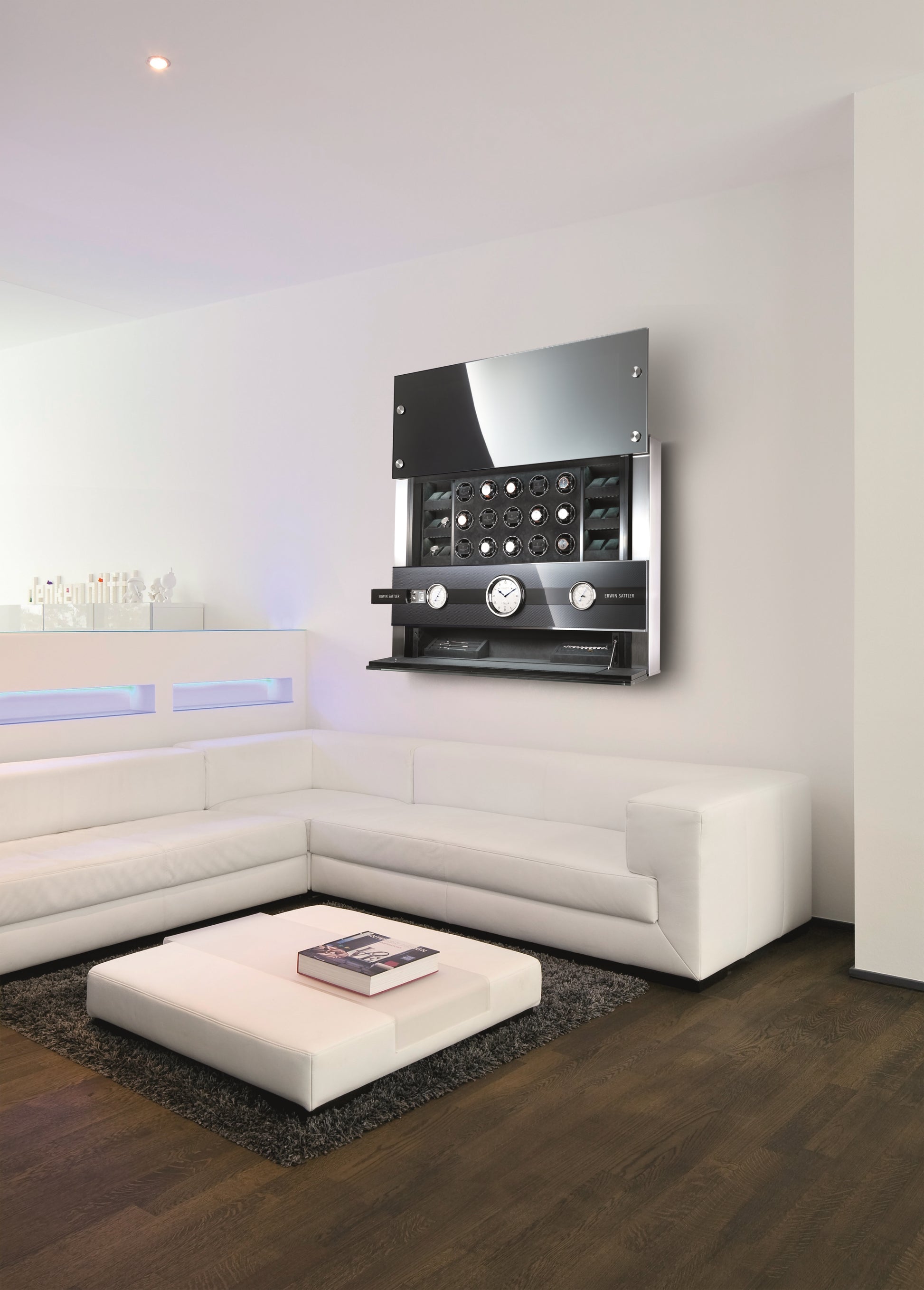 To the left and right of the watch winder module, additional space is provided for 12 manual-winding watches. Behind a lid, which is located below the winders, the Rotalis 15 offers even more comfortable space: compartments for rings, cuff links, pens or chains mean that other beautiful pieces can also be stored here, depending on what equipment is requested. The new Rotalis 15 offers the perfect storage for smaller collections. It is not just functional, it is also an enhancement: Thanks to its size and architecture, which means that it does not have pillars that reach to the floor (as can be seen on the Rotalis 30 and 60), it can be fitted almost anywhere. It can just as easily be fitted in a niche as it can be mounted on a wall, meaning that the Rotalis 15 is suitable for any living space – and adds a touch of decorativeness and harmony to its surroundings.
