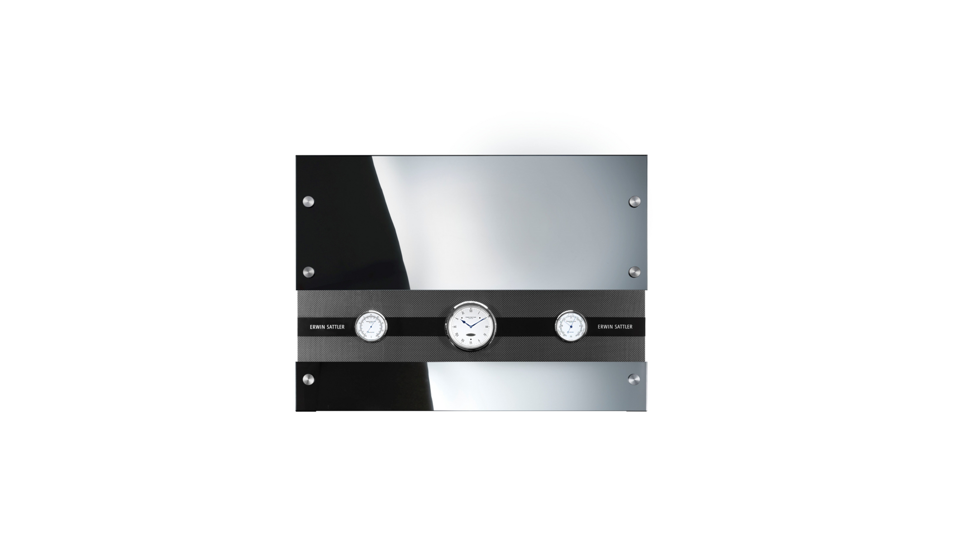 Height: ≈34.84 in (88.5 cm) (or ≈50 in (127 cm) when the glass panel is extended), width: ≈47.24 in (120 cm), depth: ≈7.87 in (20 cm) Stainless steel, choice of panel, LED illumination, integrated panel with ship clock Navis quartz, thermometer and barometer, behind the lower flap, standard equipment: 2 compartments for 4 hand-winding watches each |