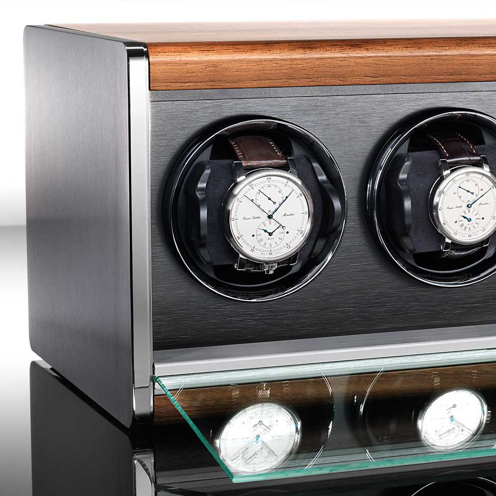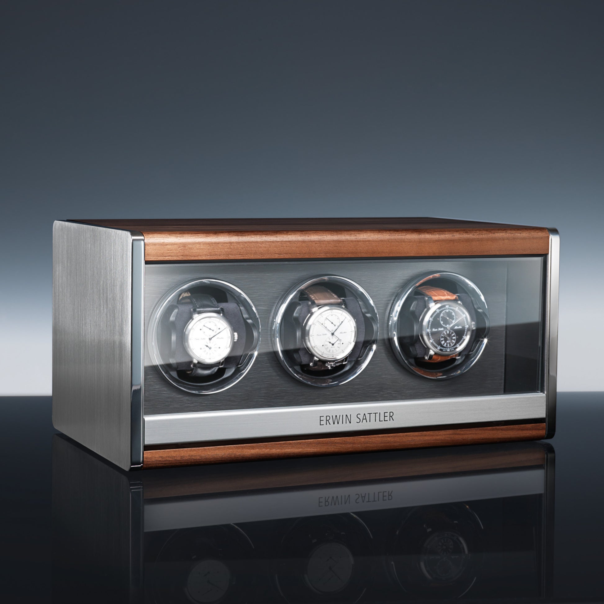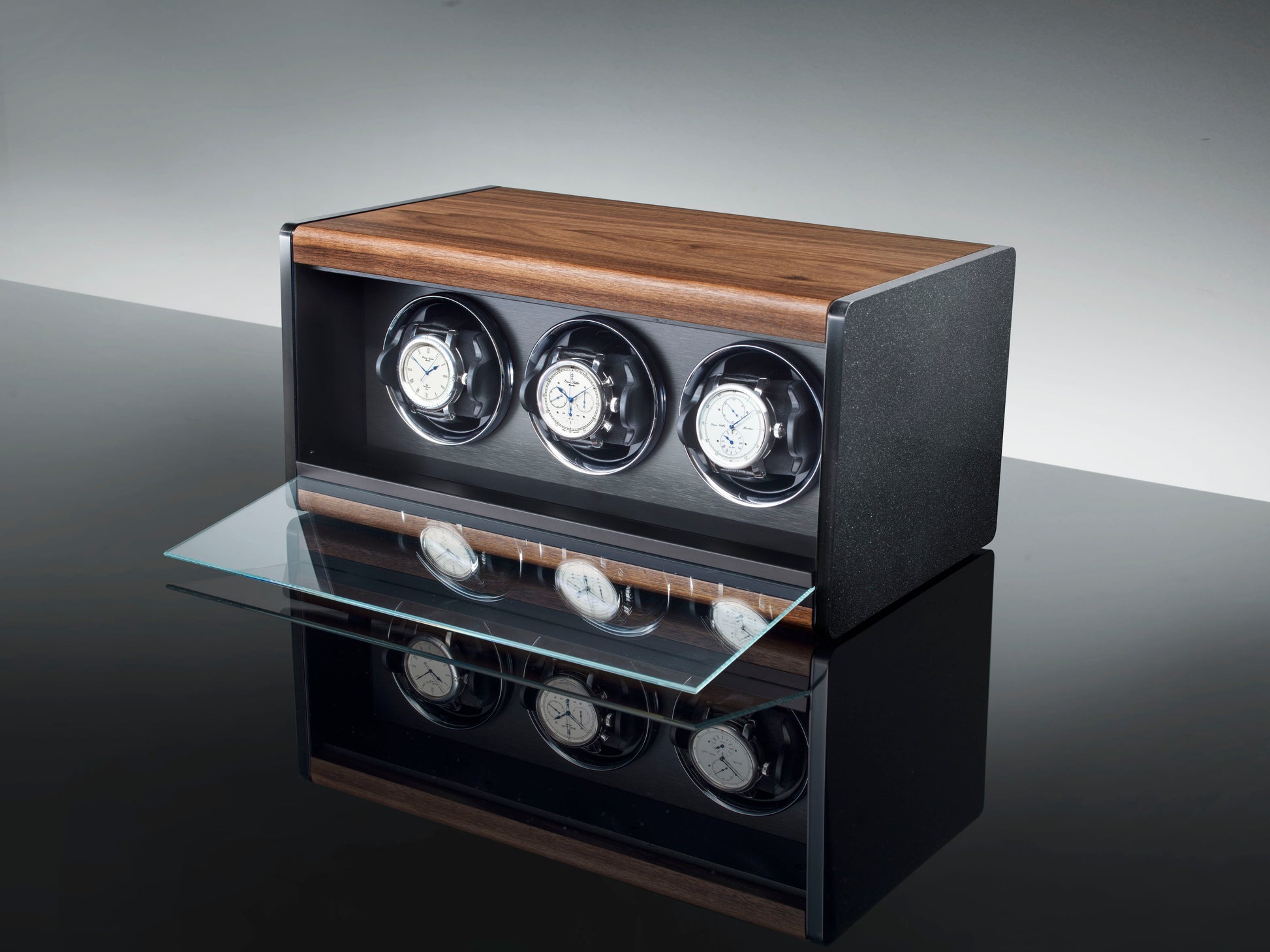 Three wristwatches finds protected behind glass its perfect place because the optimum values can be transferred from an enclosed database that contains more than 12,000 different automatic wristwatches and transmitted to the memory in the watch winder.