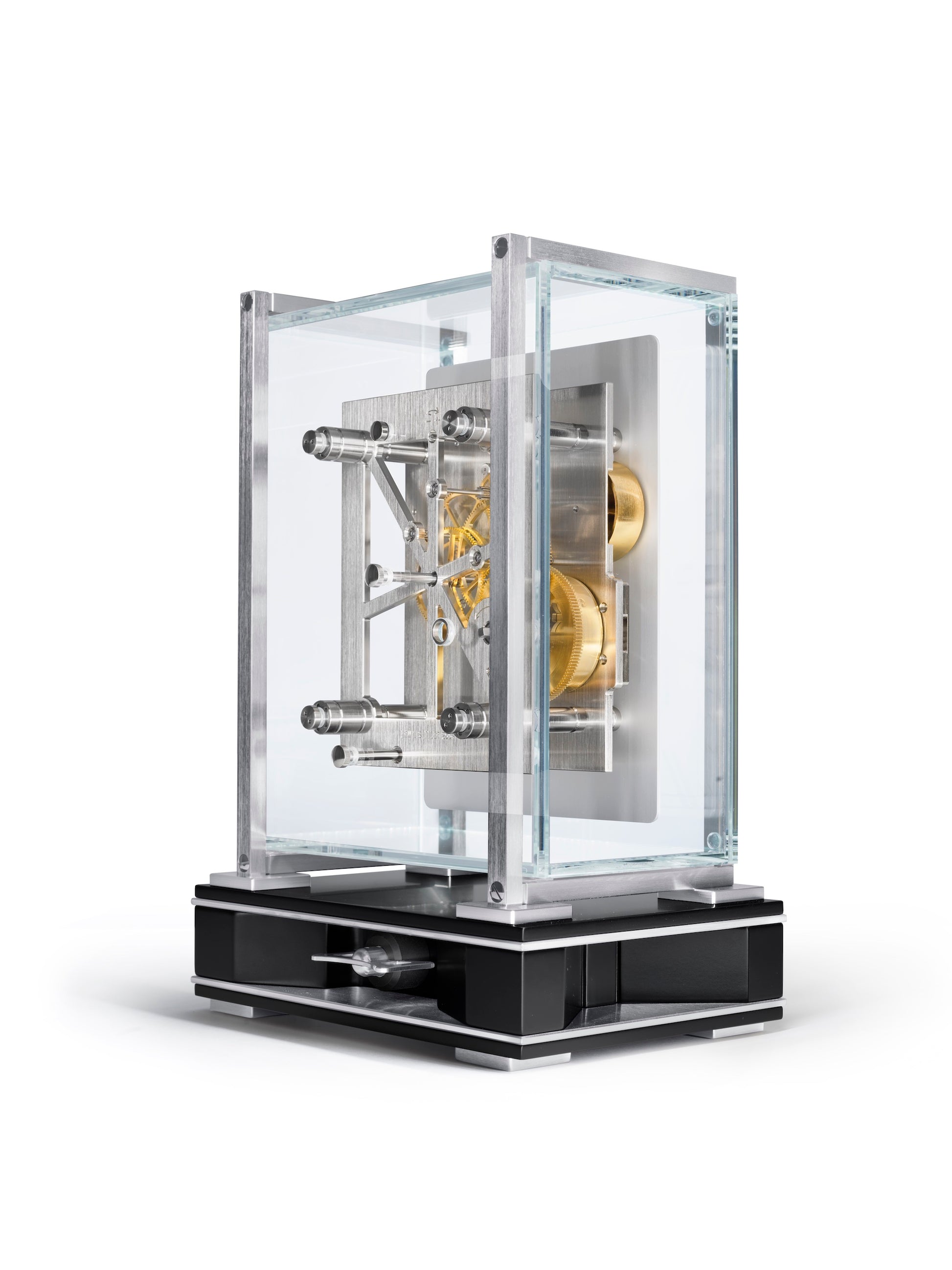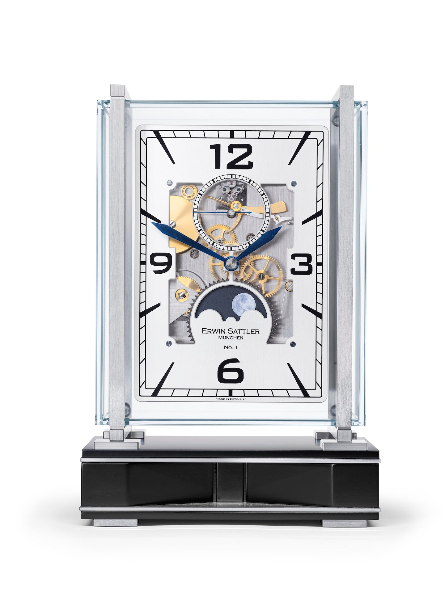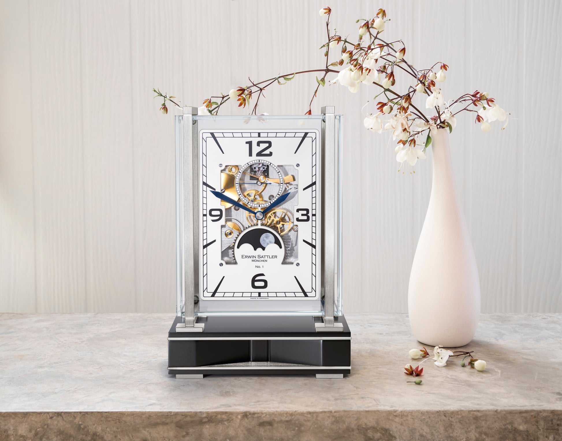 The new Operetta table clock allows an unobstructed view into every movement detail through six panes of glass.
