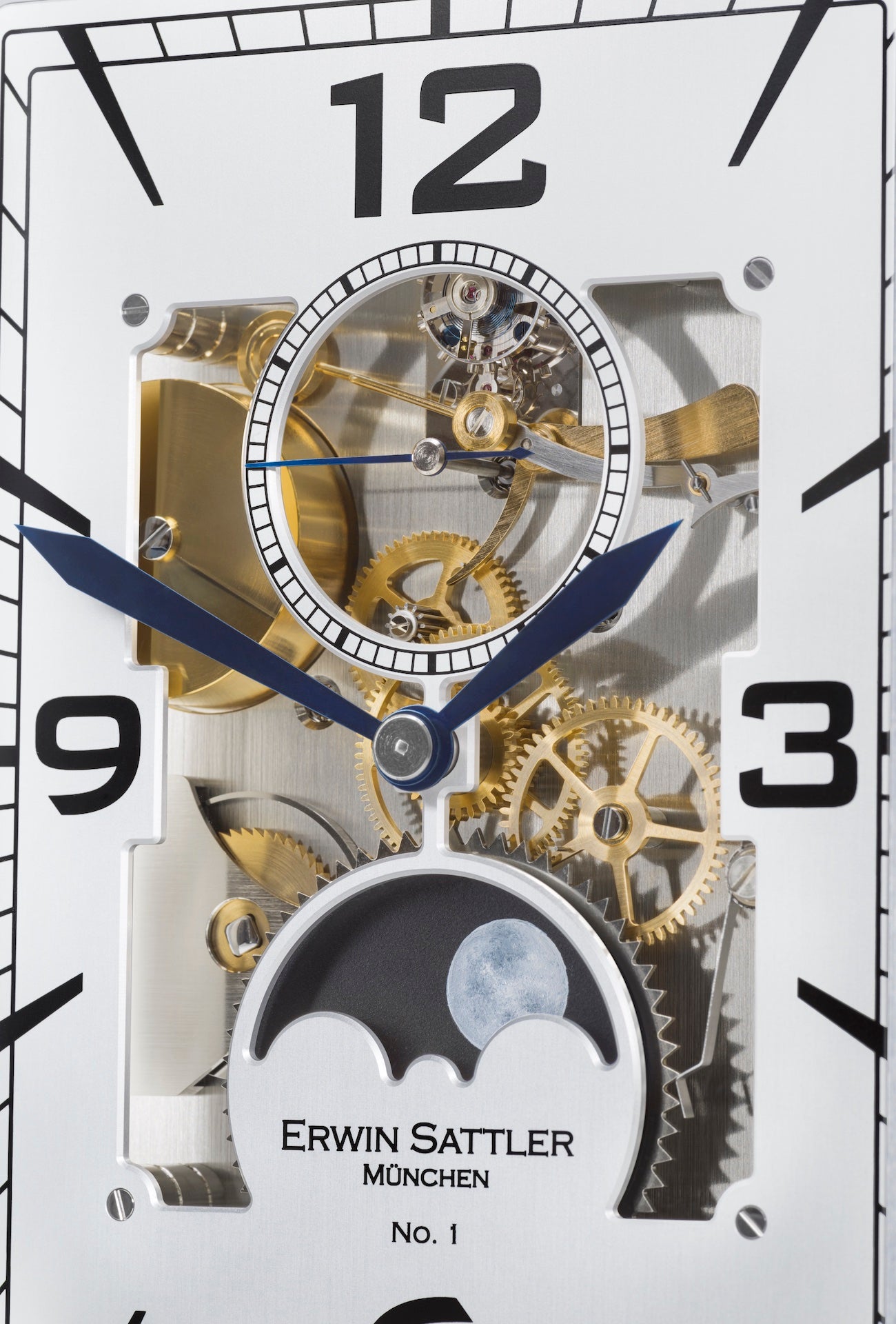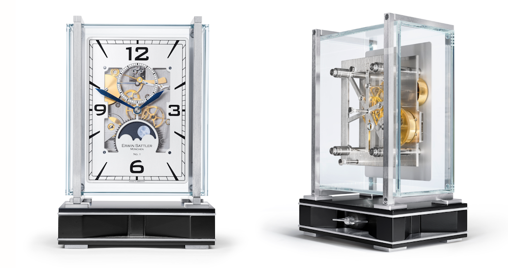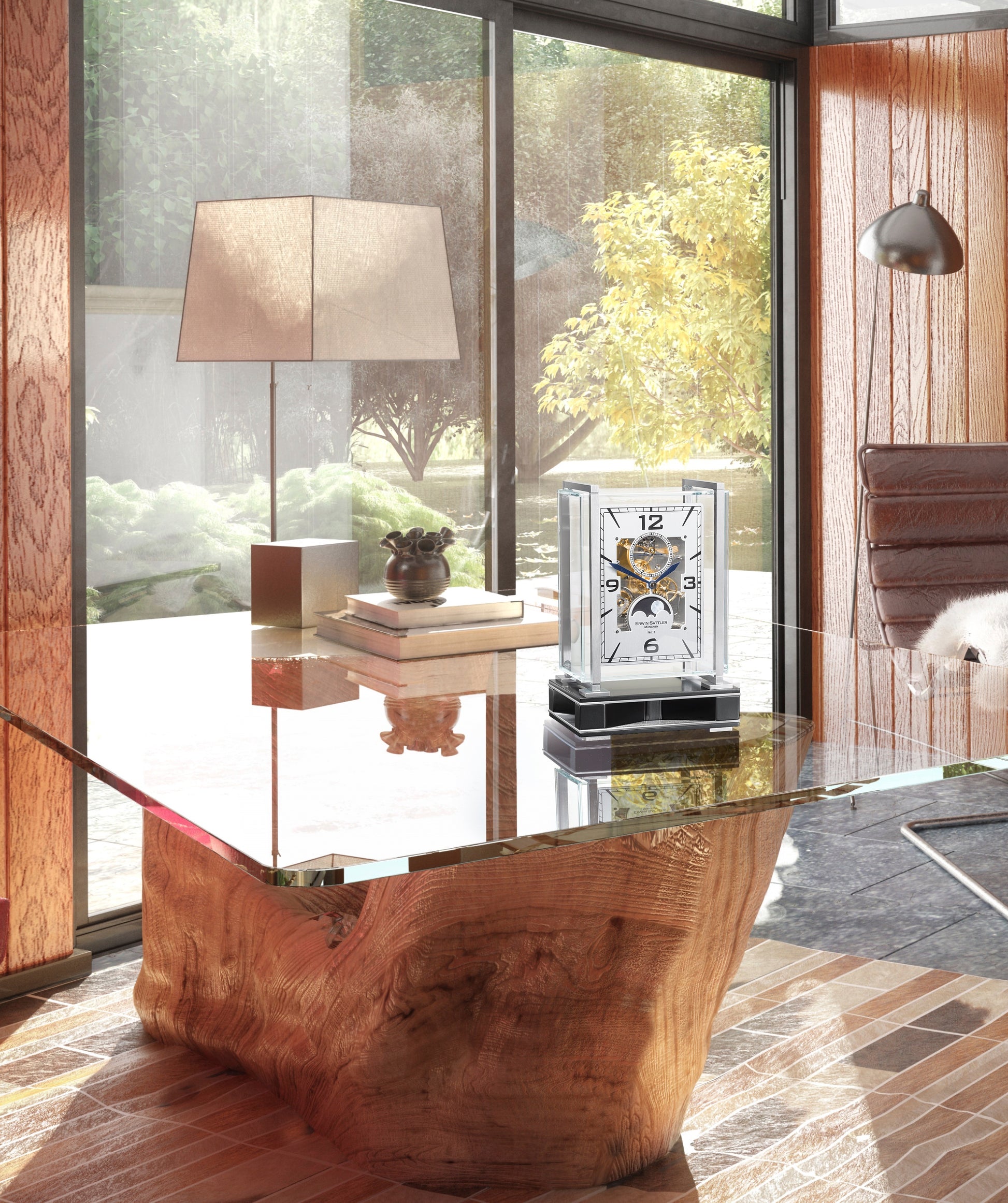 The new Operetta table clock allows an unobstructed view into every movement detail through six panes of glass.