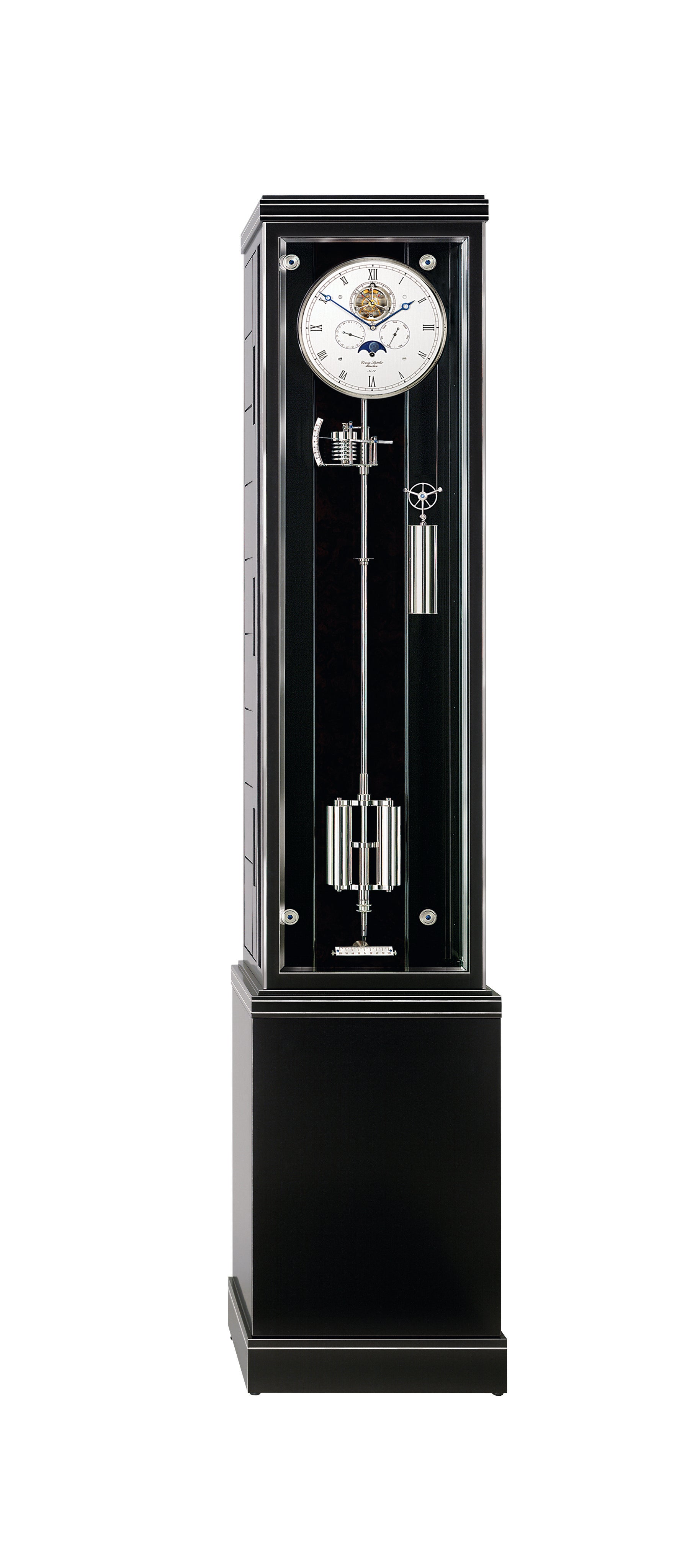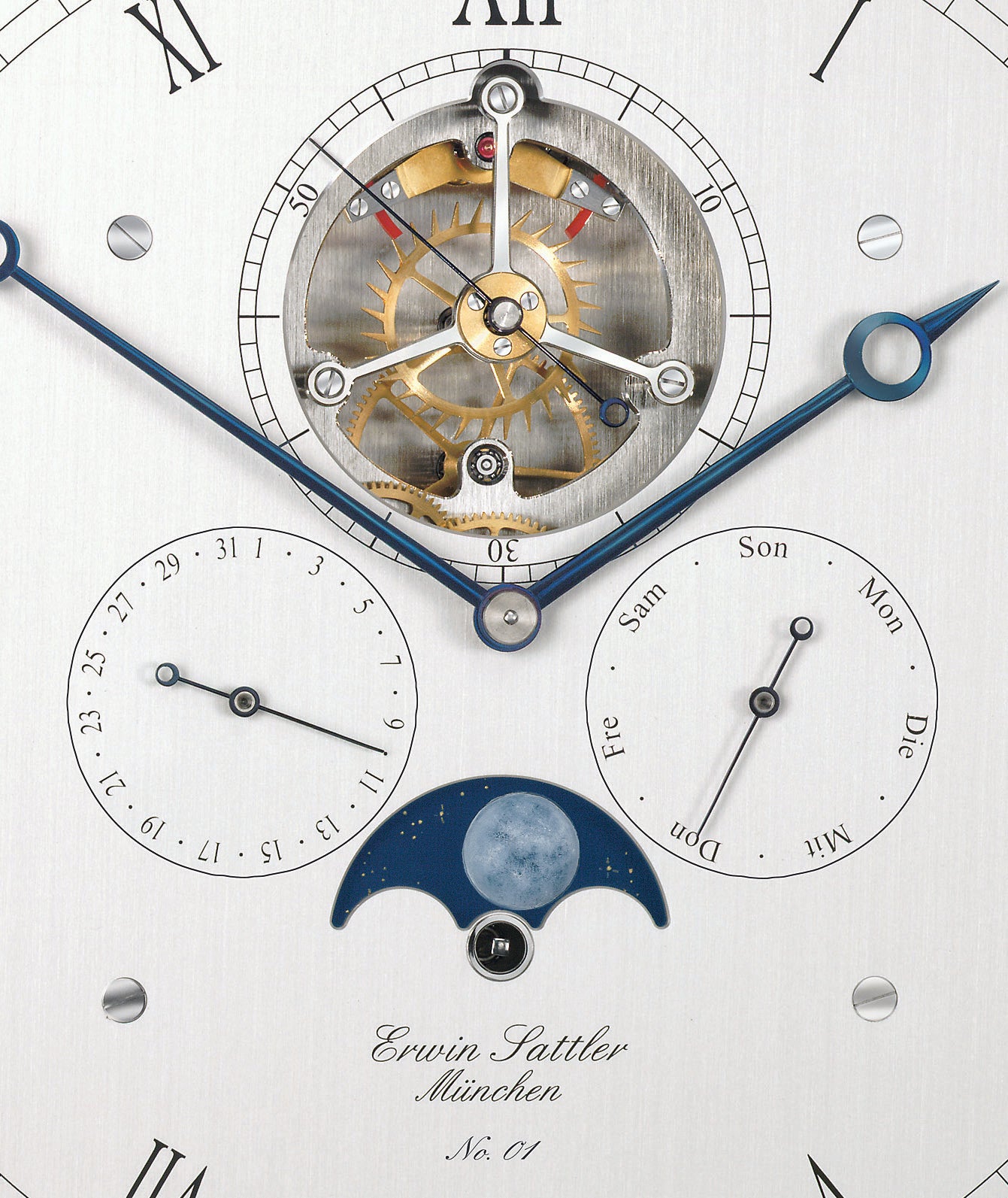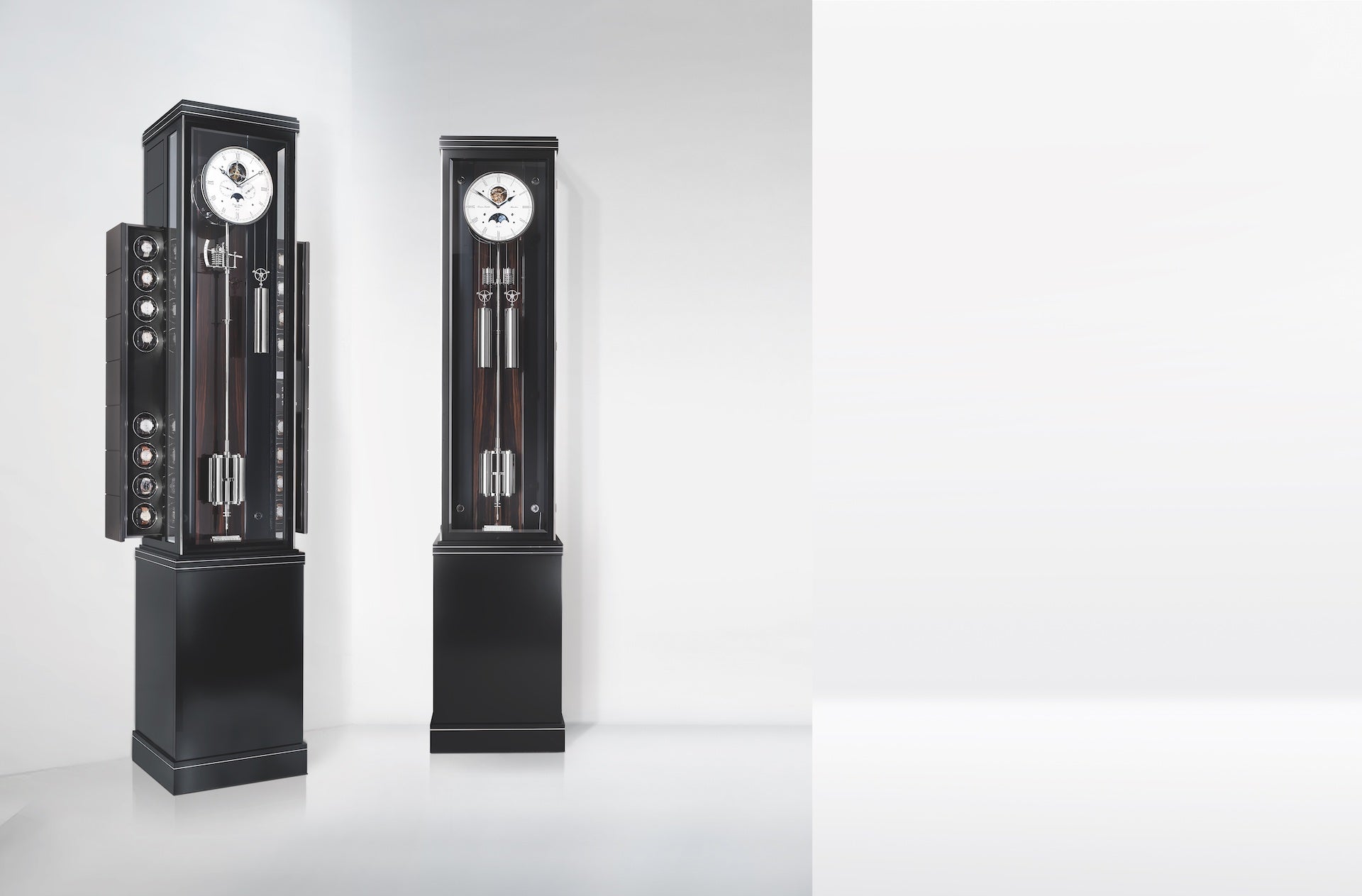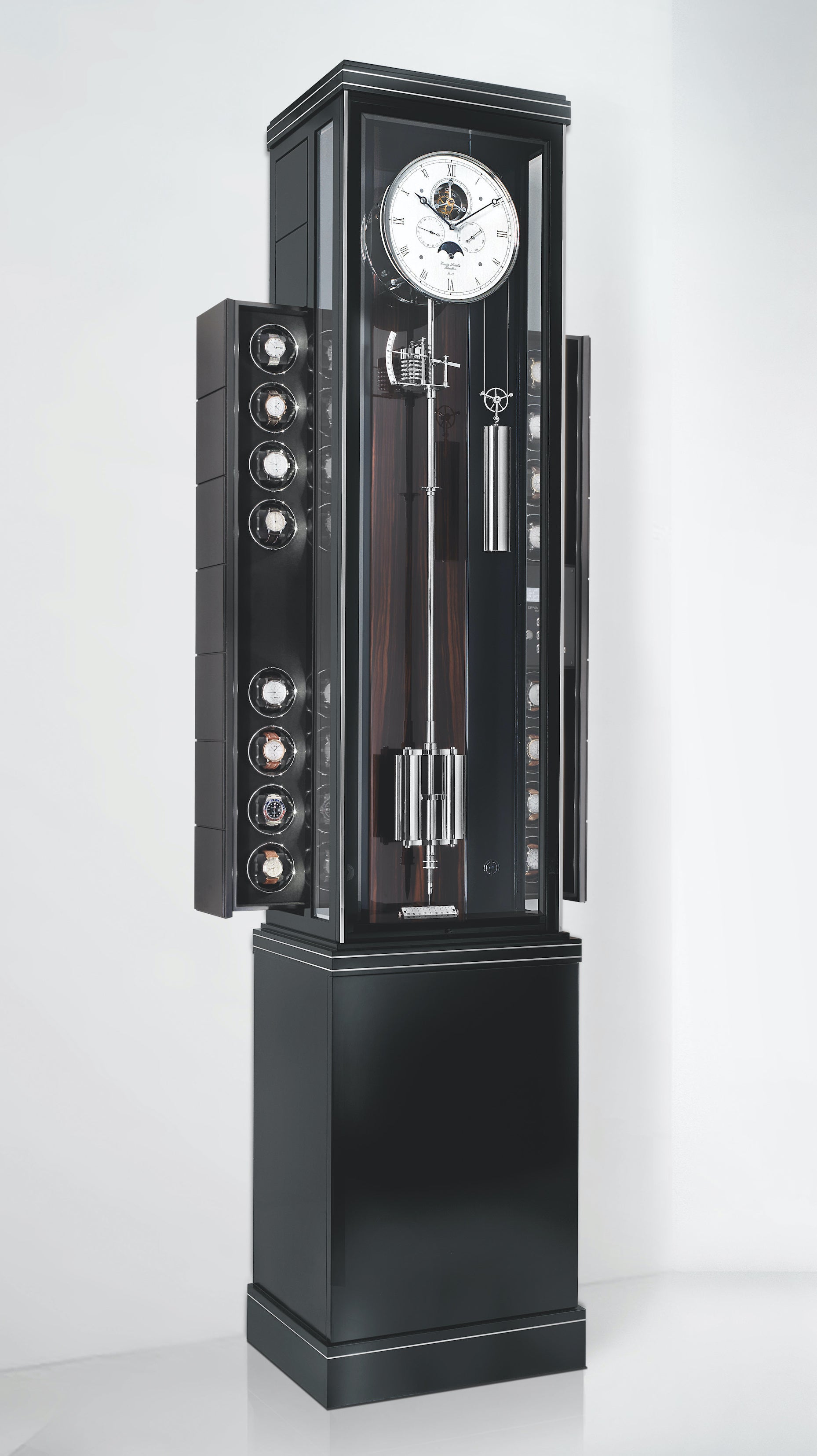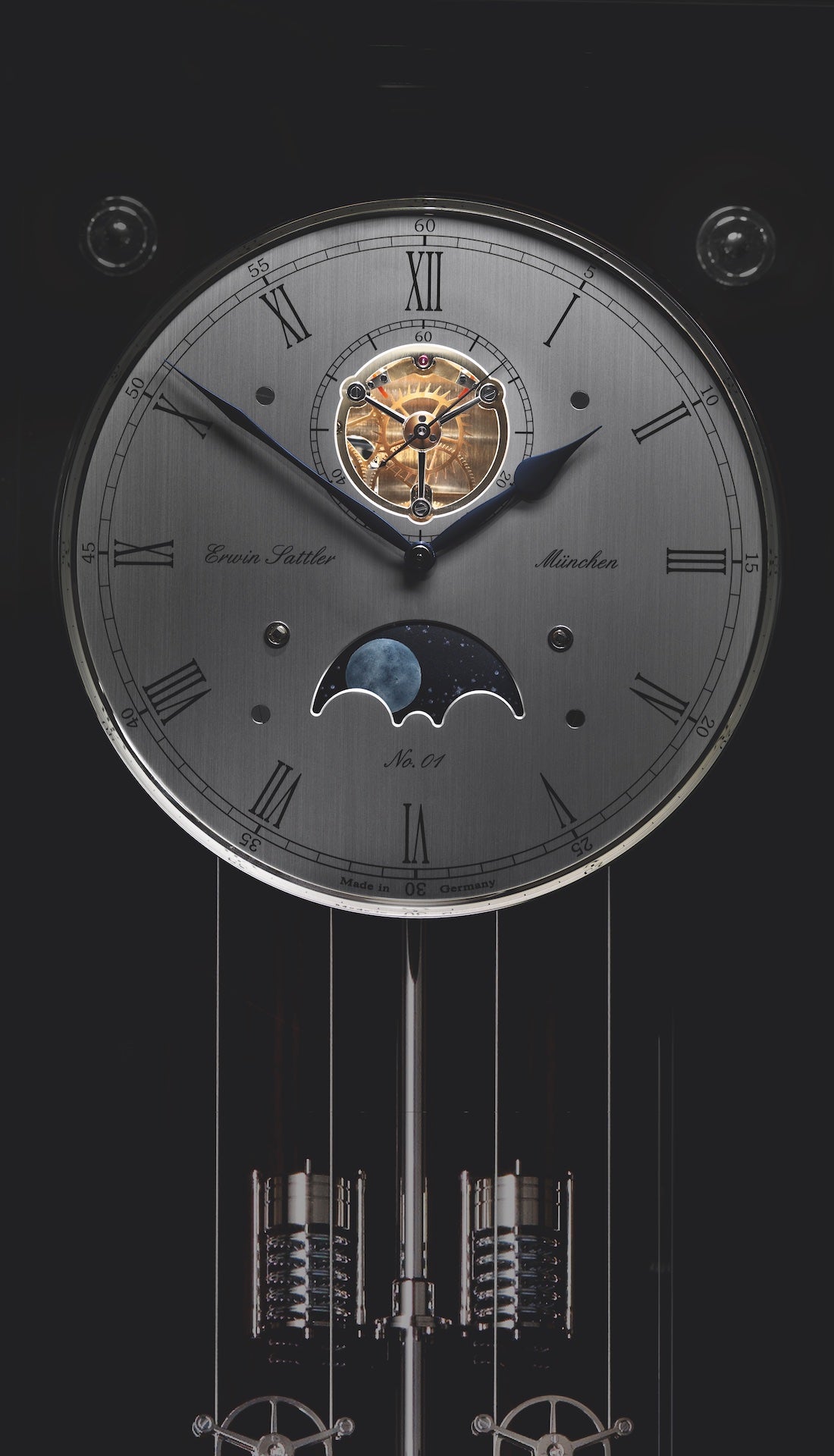 The base of the clock houses a safe which provides space for all kinds of treasures. To make full use of the depth that is gained here, 16 remote-controlled watch winders are also housed in the rear section of the case. Along with their technology partner, Beluwo®, the Erwin Sattler manufacture has developed new, large wristwatch-holders which provide enough space for larger timepieces. Each unit is equipped with its own precision motor and can be individually programmed via Bluetooth, any smartphone or tablet. The Troja Lunaris M is equipped with the extraordinary movement from the Classica Secunda 1915, whose silver-plated dial emphasises the value of the lovingly handcrafted, domed hands. The pendulum, at a stately length of approximately one metre, swings once every second in an elegant and calming cadence.