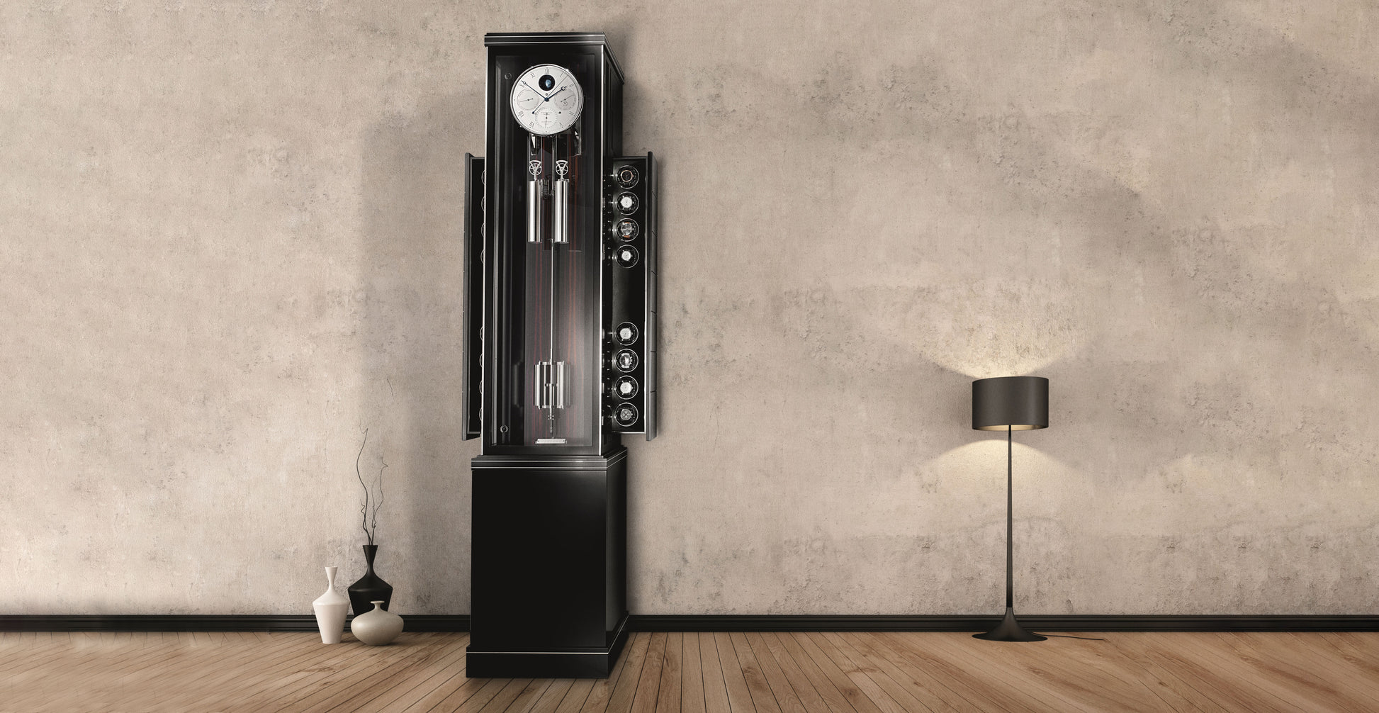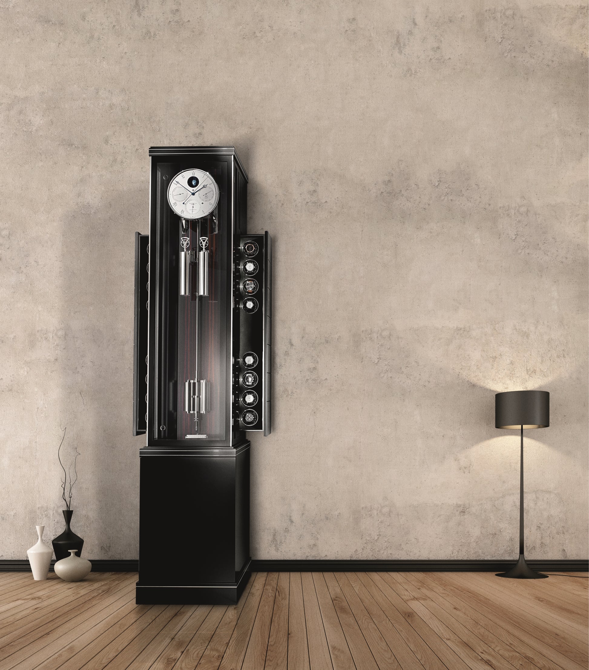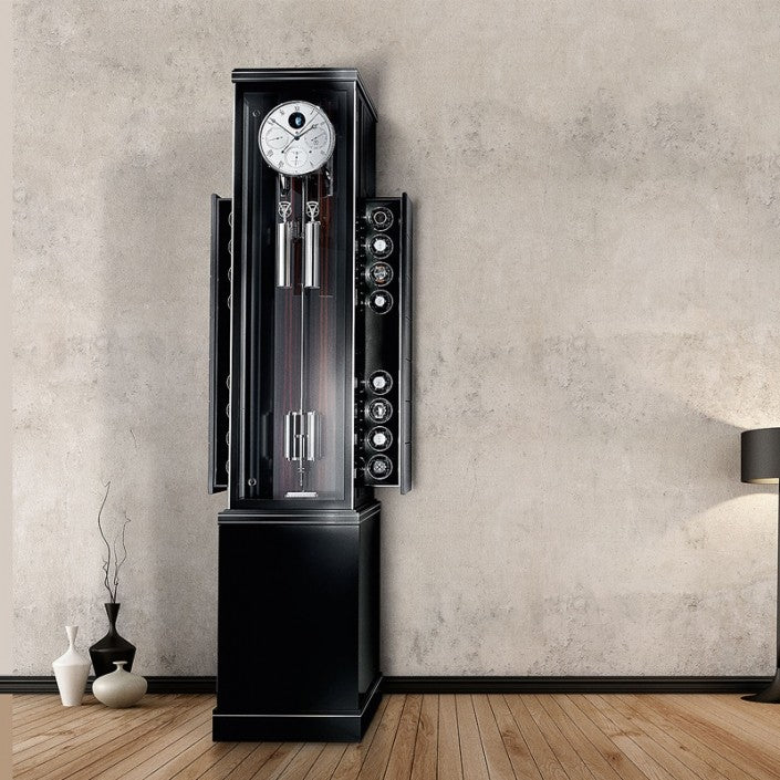 | Case | - Black varnish with macassar cassette and metal inlays Height: ≈ 87.4 in (222 cm), Width base: ≈18.7 in (47.5 cm), (watch winders extended: ≈ 28.35 in (72 cm)), Depth: 16.93 in (43 cm), requires wall mounting at the dial height Door with magnetic closure |