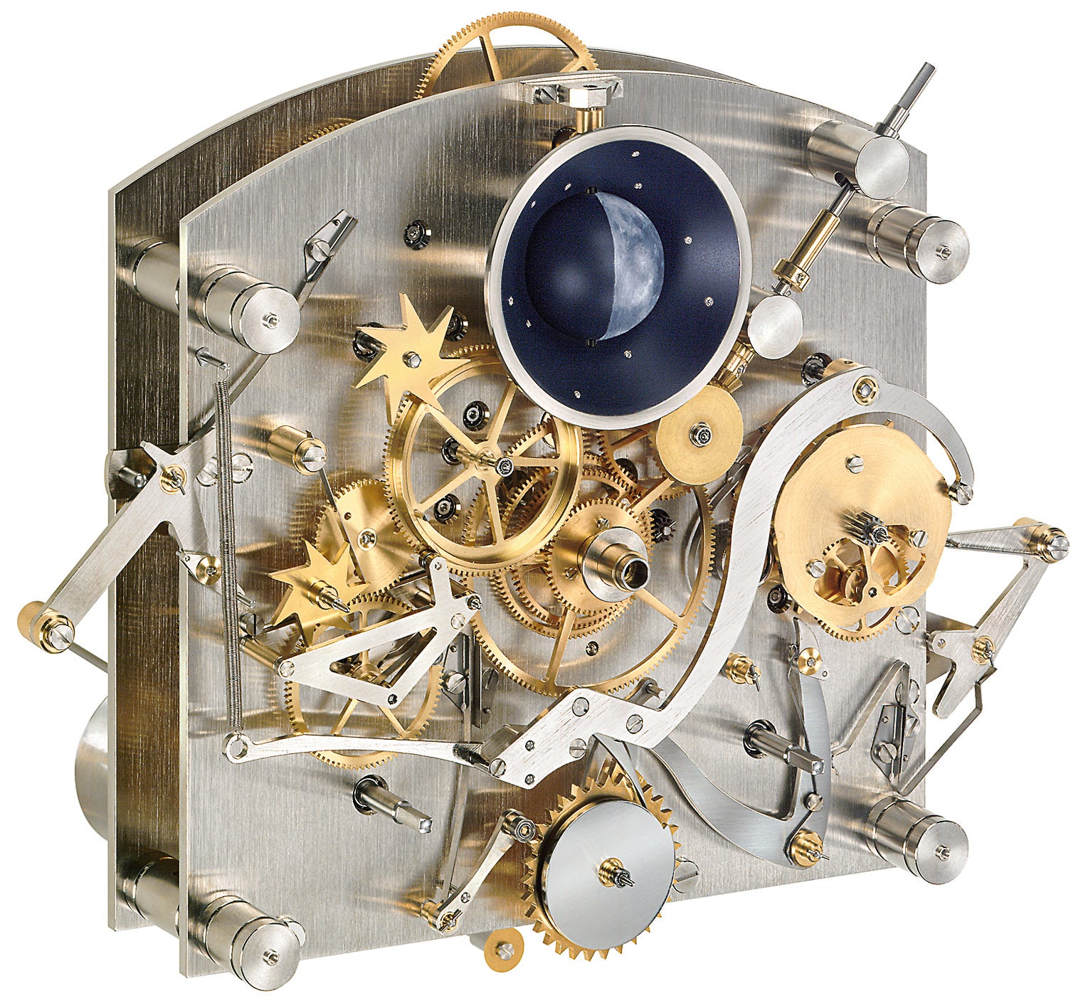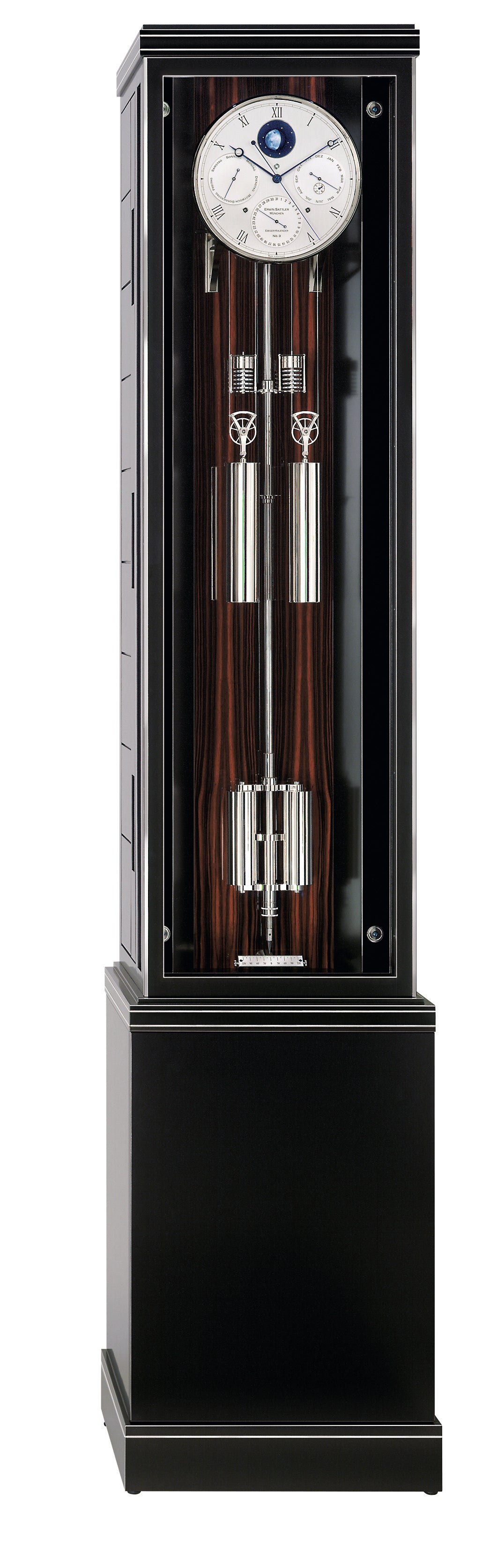This masterpiece from the Erwin Sattler manufacture is not just a precision clock according to the classical definition but, with the Opus Temporis, it also has a “perpetual calendar” with three-dimensional, hand-painted moon phase. This turns in front of a funnel that is studded with ten brilliant-cut diamonds and impressively illustrates the night sky. From a technical point of view, its calculation and conversion are also fascinating, and only have to be corrected by one day every 120 years. Furthermore, this fine longcase clock delights owners with its sonorous half-hour strike.