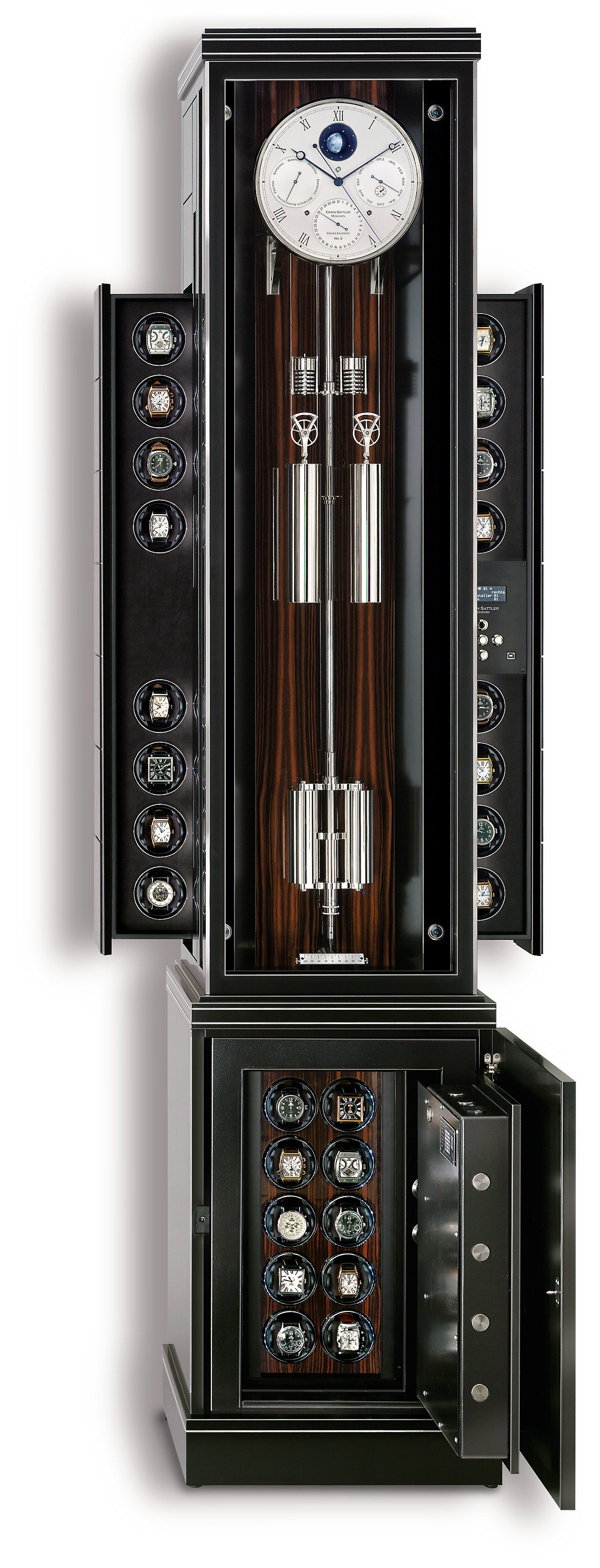 Its character is complemented by the features of the Troja. When you press the remote control, 16 programmable watch winders move forward behind the pendulum clock. The database that comes with the clock contains the parameters for more than 8,000 wristwatch models. Each wristwatch thus receives exactly the amount of energy that is recommended by the manufacturer. A safe, which is hidden behind a closed door in the base of the clock, has drawers in which to store other collectibles and treasures such as chains, rings and manual winding wristwatches.
