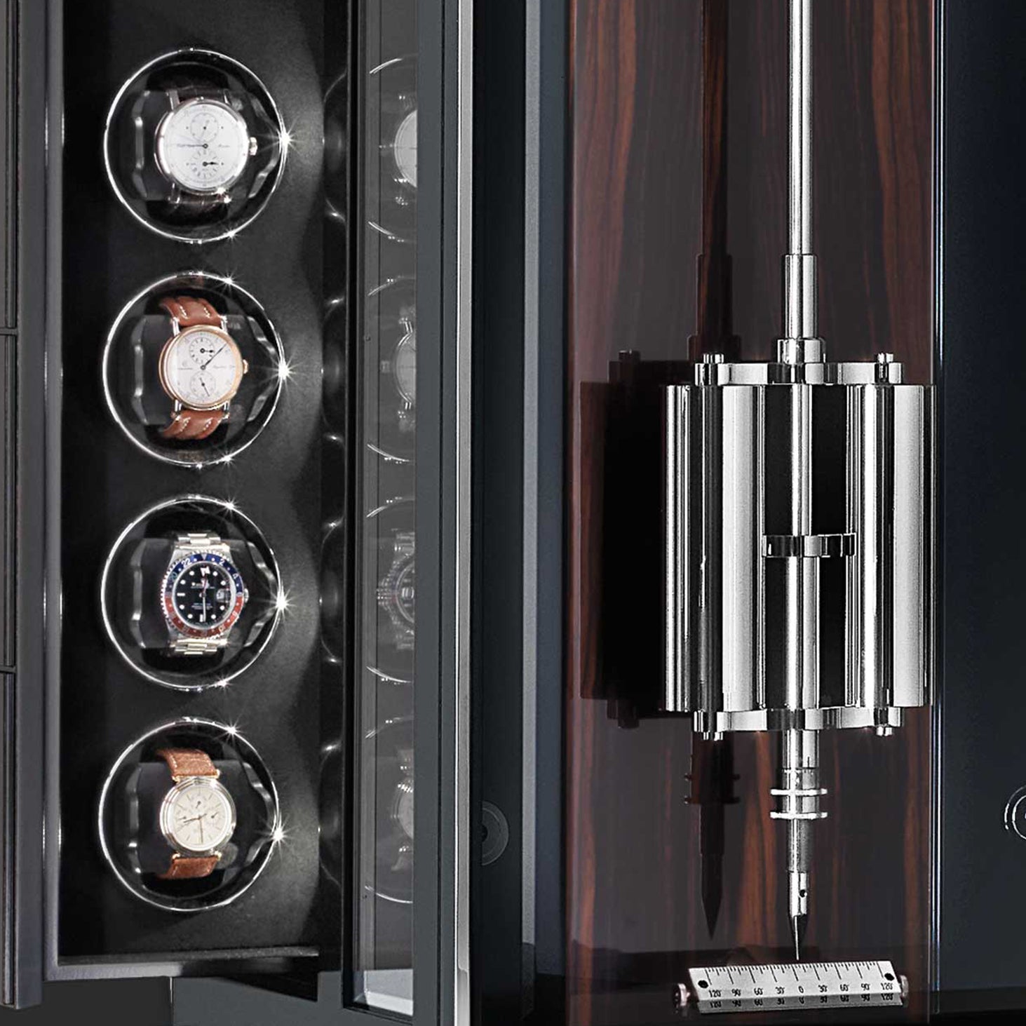 | Winders | 16 precision watch winders, sideways extendible, individually programmable via WLAN, 16 high-power motors, 12 o’clock position |