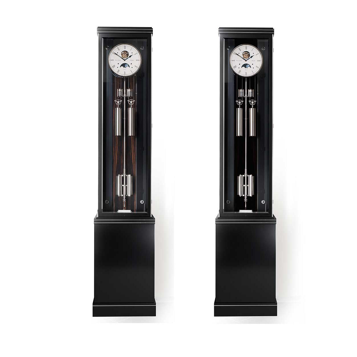 The base of the clock houses a safe which provides space for all kinds of treasures. To make full use of the depth that is gained here, 16 remote-controlled watch winders are also housed in the rear section of the case. Along with their technology partner, Beluwo®, the Erwin Sattler manufacture has developed new, large wristwatch-holders which provide enough space for larger timepieces. Each unit is equipped with its own precision motor. There is no remote control anymore. Controlling works only via Bluetooth, any smartphone or tablet, or via the operating element in the integrated tray in the housing. The Troja 16 M is equipped with the extraordinary movement from the Classica Secunda 1995, whose silver-plated dial emphasises the value of the lovingly handcrafted, domed hands. The pendulum, at a stately length of approximately one metre, swings once every second in an elegant and calming cadence.